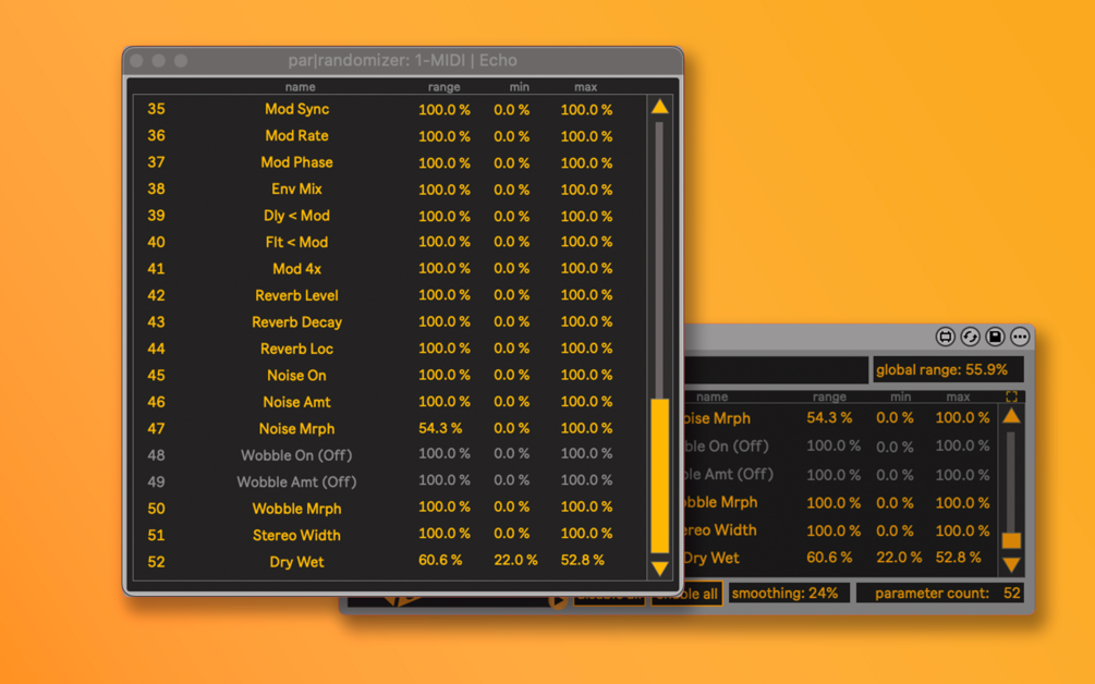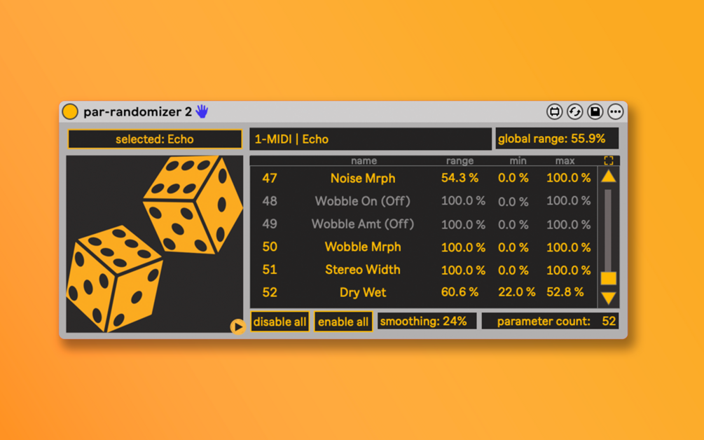 - retains parameters on re-mapping to device with same parameters (so you can retain parameters even when copy-pasting/duplicating par-randomizer 2 and mapped device, or remap to other instance of same device type without losing your settings)